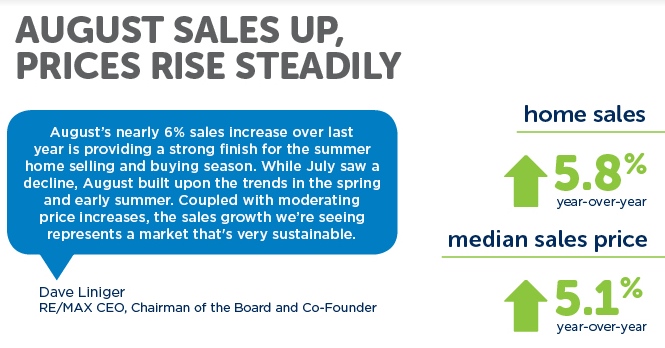 August home sales increased 5.8% over a year ago, reversing July’s decline of 8.8%. At the same time, the median price climbed 5.1% as steady monthly increases continued. August sales were up year-over-year in 41 of the 53 U.S. metro areas analyzed in the RE/MAX National Housing Report. Twelve metro areas posted double-digit increases, including major markets along the east coast from Washington, DC to Charlotte, NC. So far in 2016, seven of the eight months have seen year-over-year sales increases nationally.