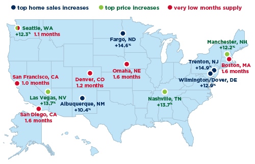 The combination of increased sales and a record low inventory that slipped further to 2.8 months resulted in higher sales prices. June’s median sales price of $245,000, up 7.5% over last June, also set a RE/MAX National Housing report record. In fact, prices increased in 50 of the report’s 53 markets.