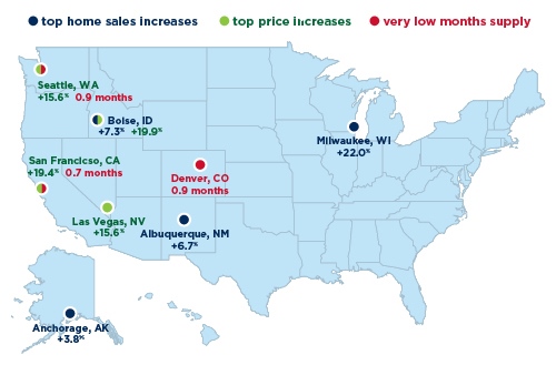 When the Months Supply of Inventory falls below six months, it’s a seller’s market, and all 54 metro areas surveyed for the monthly housing reported under six months of inventory.