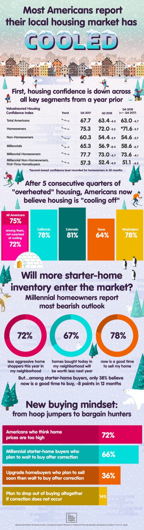 For the past five quarters, the majority of Americans said their housing markets were overheating. Now, in the fourth quarter, 75 percent of Americans say their local housing market is starting to cool, according to ValueInsured’s Q4 2018 Modern Homebuyer Survey. Homeowners in California, Colorado, Texas, and Washington are most likely to say their local market is starting to cool off.