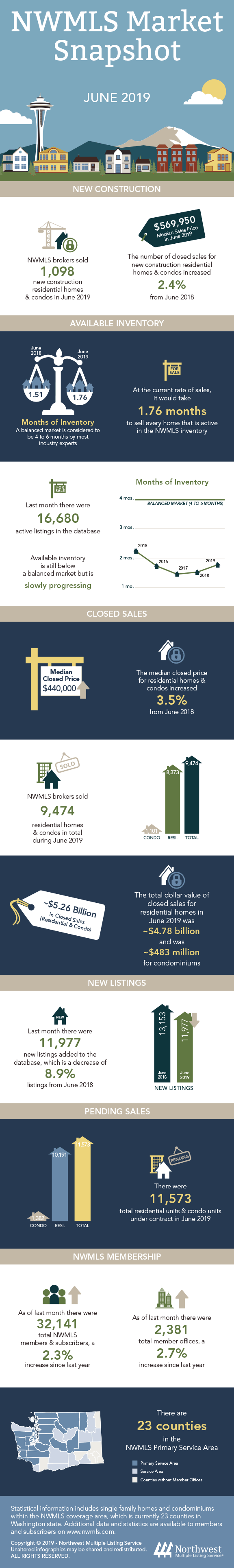Inventory, pending sales and prices all increased during June compared to a year ago, according to the latest report from Northwest Multiple Listing Service. The same report, which covers 23 counties in Washington state, shows year-over-year drops area-wide in both the volume of new listings and closed sales.