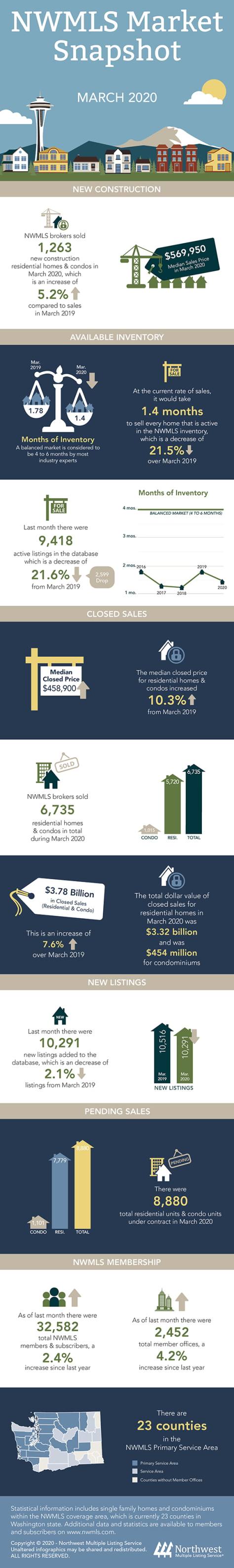 Despite limitations, Northwest MLS brokers added 10,291 new listings to the database during March, outgaining February by 2,505 listings (up 31.2%) and nearly matching the year-ago number (10,516). At the end of March, there were 9,418 active listings in the NWMLS database, a drop of nearly 22% from twelve months ago, but a gain of 23% from February. Area-wide, there was 1.4 months of supply, but it ranged from less than a month in both Snohomish and Thurston counties to more than nine months in San Juan County.
