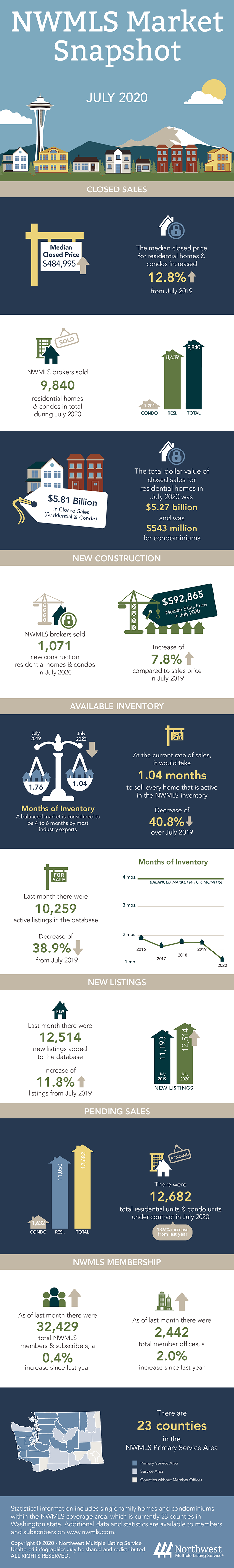 An unprecedented eight counties in the NWMLS report had less than one month’s supply of homes and condominiums for sale at the end of July. They included Clark, Cowlitz, Island, Kitsap, Mason, Pierce, Snohomish, and Thurston.