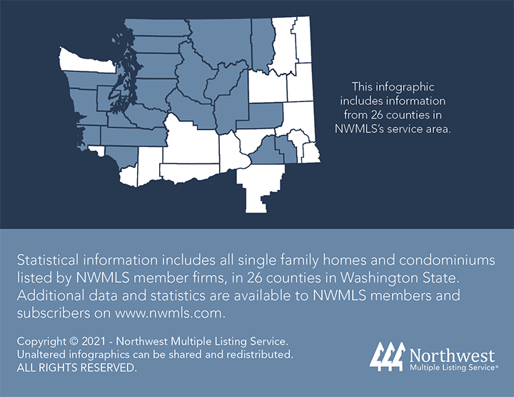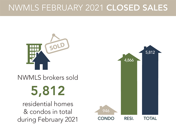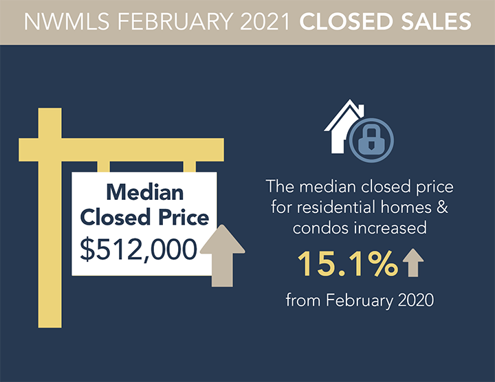 Northwest MLS member-brokers reported 5,812 closed sales during February for a 10.4% increase over the year-ago total of 5,265 closings. The median price on last month’s completed sales jumped more than 15% from a year ago, increasing from $445,000 to $512,000. Twenty of the 26 counties in the report showed double-digit YOY price gains.