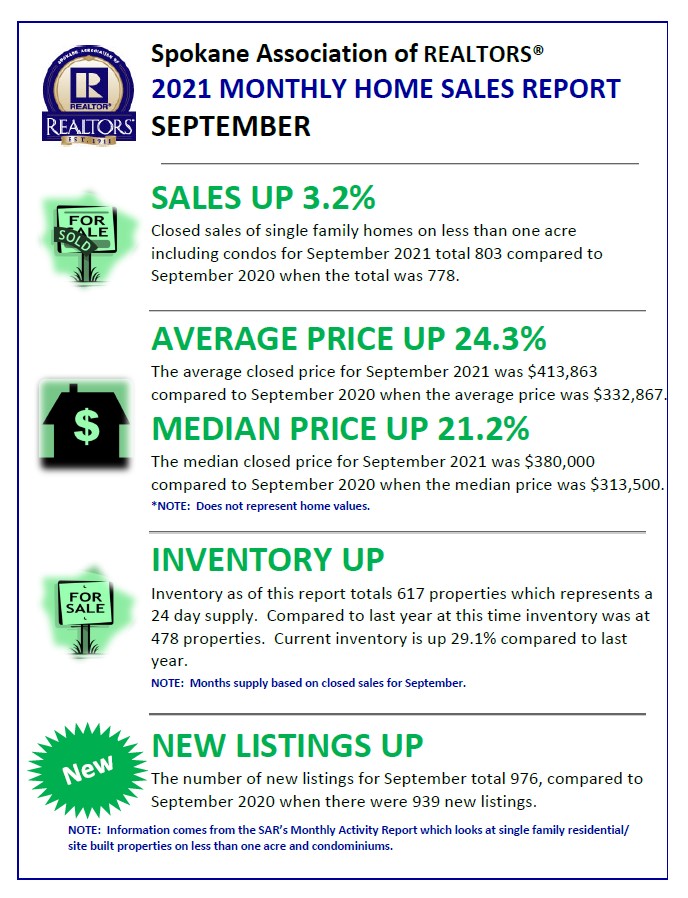 October 15, 2021 by Managing The Real Estate Details Spokane Association of Realtors® Home Sales Report for September 2021 The Spokane market continues a sales pace similar to last year and to have more demand than supply, however inventory is beginning to see modest growth. Source: SAR MLS 10/21 Share this: Share on Facebook (Opens in new window) Facebook Share on LinkedIn (Opens in new window) LinkedIn Share on X (Opens in new window) X Share on Pinterest (Opens in new window) Pinterest Share on Nextdoor (Opens in new window) Nextdoor Email a link to a friend (Opens in new window) Email Print (Opens in new window) Print Like Loading... Related