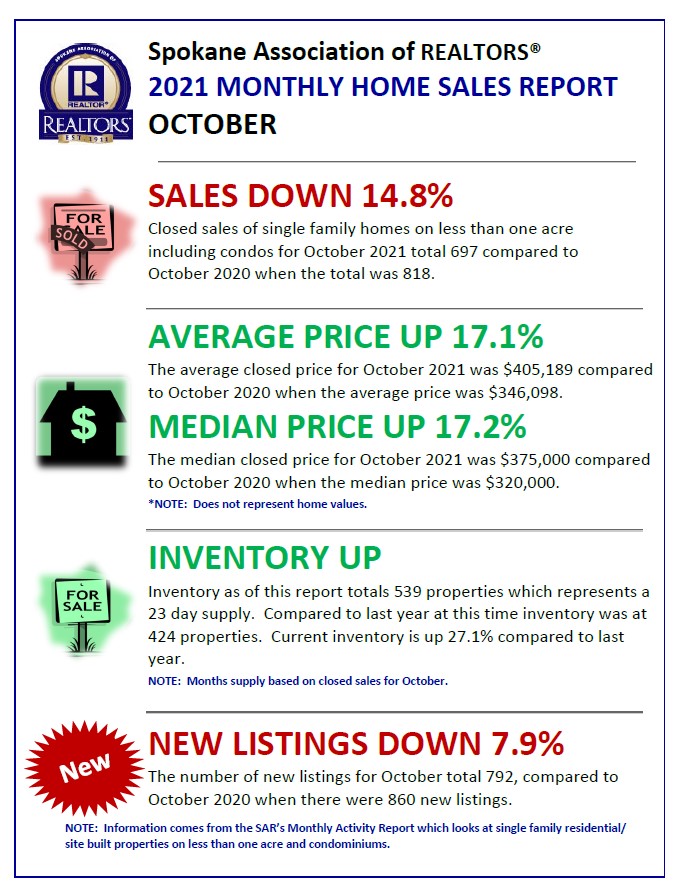 November 23, 2021 by Managing The Real Estate Details Spokane Association of Realtors® Home Sales Report for October 2021 The Spokane market continues a sales pace similar to last year and to have more demand than supply, however inventory is beginning to see modest growth. Source: SAR MLS 11/21 Share this: Share on Facebook (Opens in new window) Facebook Share on LinkedIn (Opens in new window) LinkedIn Share on X (Opens in new window) X Share on Pinterest (Opens in new window) Pinterest Share on Nextdoor (Opens in new window) Nextdoor Email a link to a friend (Opens in new window) Email Print (Opens in new window) Print Like Loading... Related