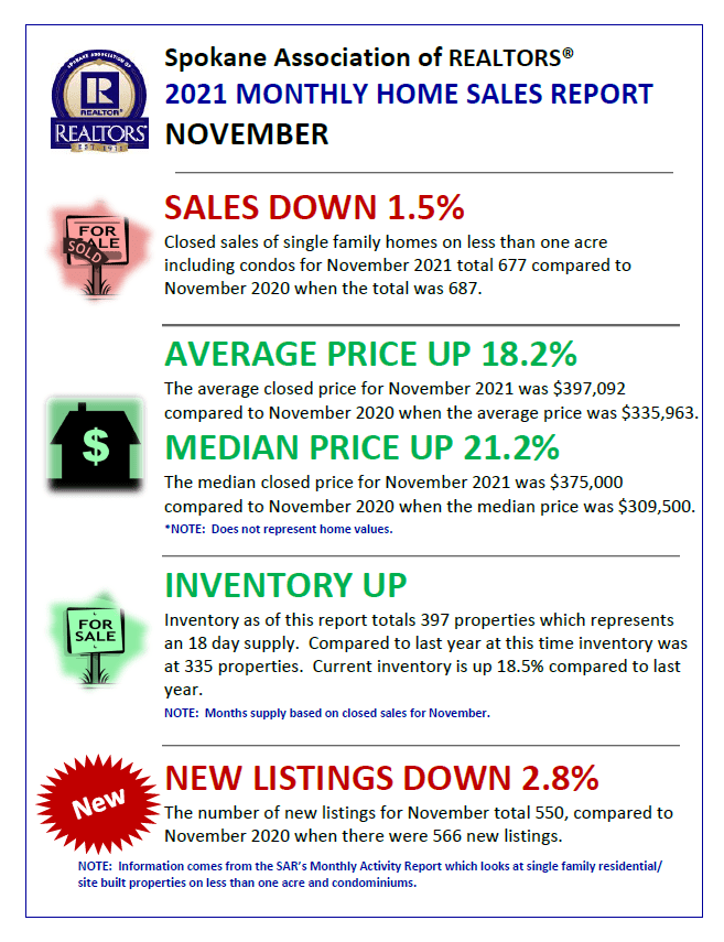 December 13, 2021 by Managing The Real Estate Details Spokane Association of Realtors® Home Sales Report for November 2021 The Spokane market continues a sales pace similar to last year and to have more demand than supply, however inventory is beginning to see modest growth. Source: SAR MLS 12/21 Share this: Share on Facebook (Opens in new window) Facebook Share on LinkedIn (Opens in new window) LinkedIn Share on X (Opens in new window) X Share on Pinterest (Opens in new window) Pinterest Share on Nextdoor (Opens in new window) Nextdoor Email a link to a friend (Opens in new window) Email Print (Opens in new window) Print Like Loading... Related