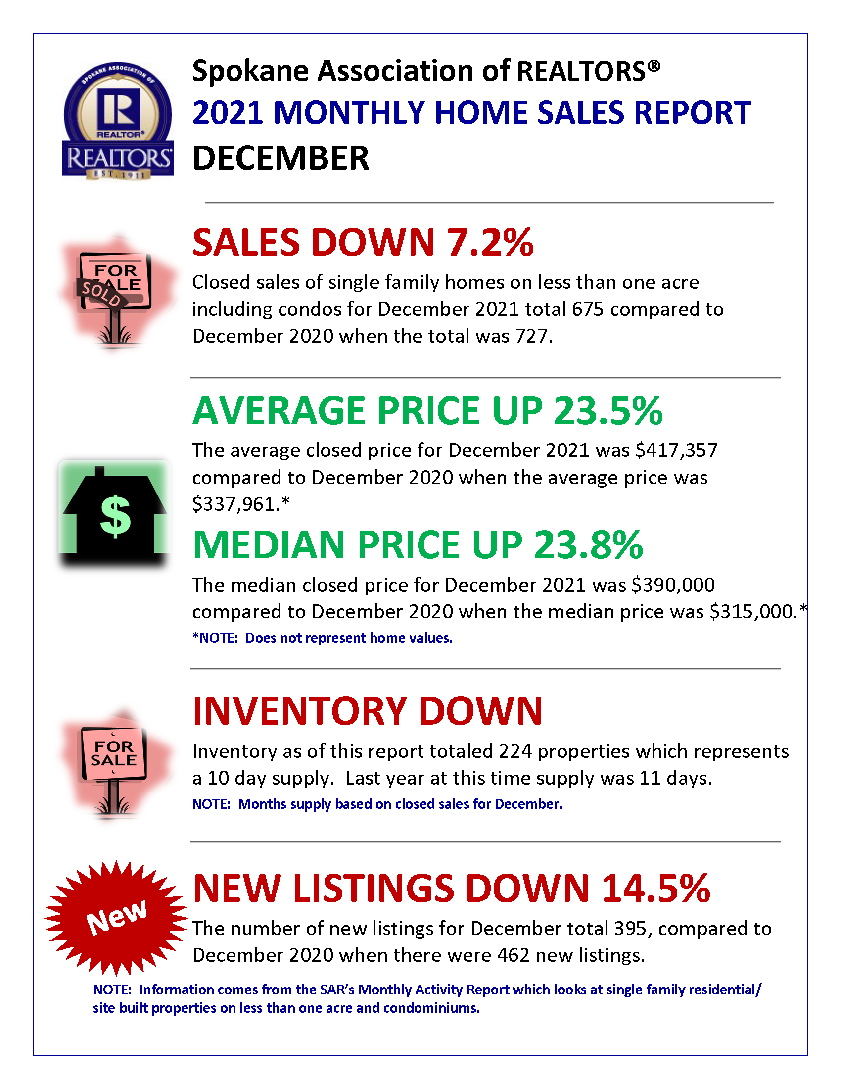 January 19, 2022 by Managing The Real Estate Details Spokane Association of Realtors® Home Sales Report for December 2021 The Spokane market continues a sales pace similar to last year and to have more demand than supply, however inventory is beginning to see modest growth. Source: SAR MLS 1/22 Share this: Share on Facebook (Opens in new window) Facebook Share on LinkedIn (Opens in new window) LinkedIn Share on X (Opens in new window) X Share on Pinterest (Opens in new window) Pinterest Share on Nextdoor (Opens in new window) Nextdoor Email a link to a friend (Opens in new window) Email Print (Opens in new window) Print Like Loading... Related