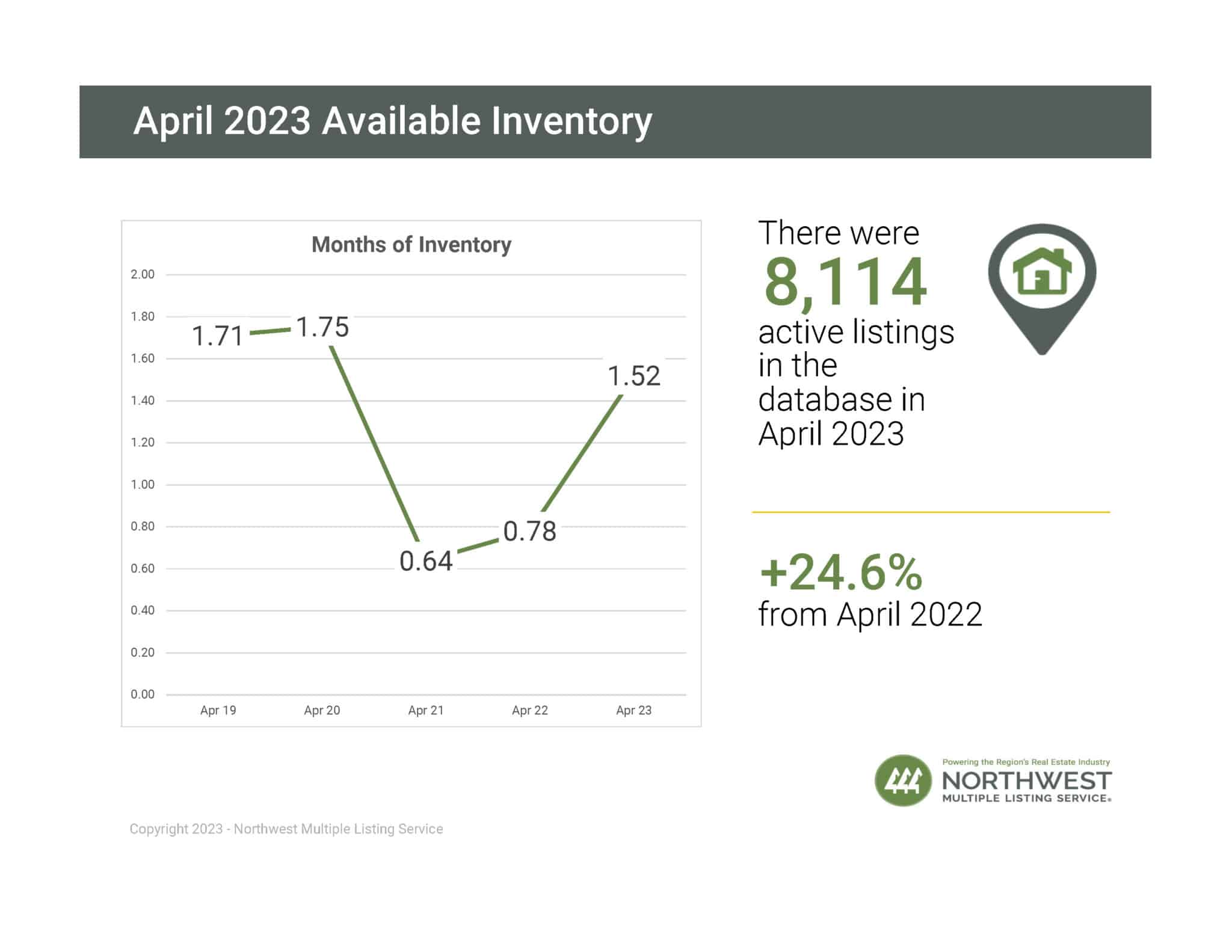 At the end of April, there were 8,114 active listings in the NWMLS database, an increase of 1,600 from the year-ago supply for a gain of nearly 24.6%.
