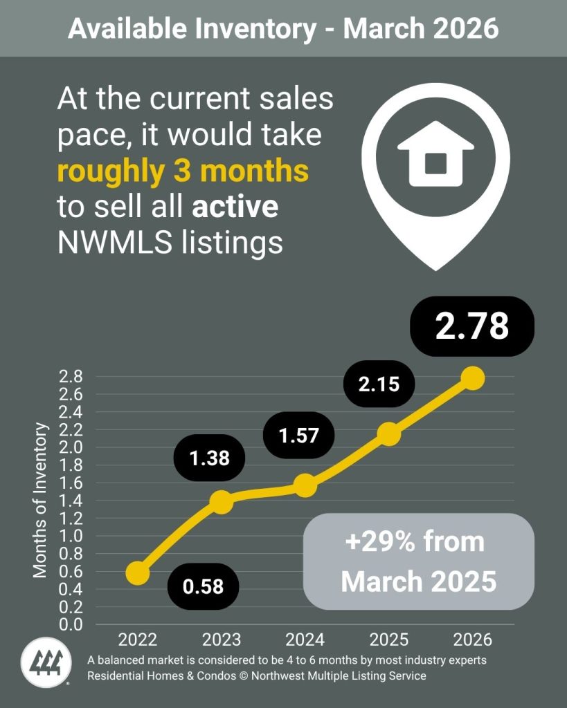 A continued rise in inventory, combined with renewed pressure from rising mortgage rates, defined Washington’s housing market in March as listings climbed sharply while sales remained largely unchanged.