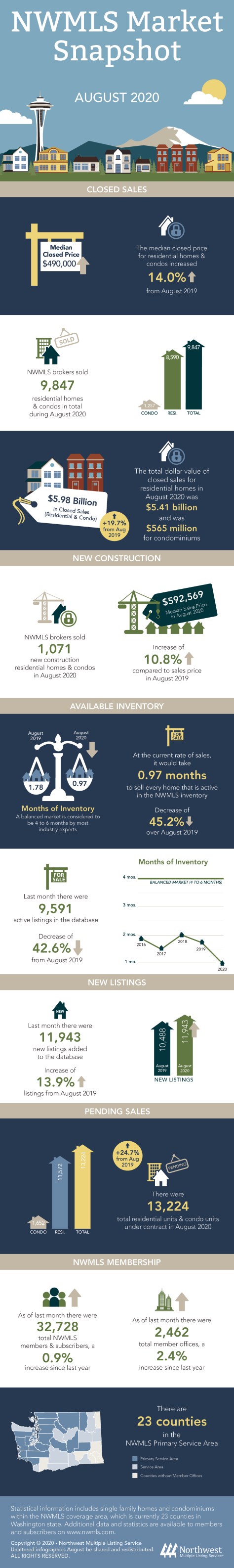 At the end of August, the Northwest MLS database included 9,591 total active listings, down almost 43% from a year ago when the selection totaled 16,697 listings. With pending sales (13,224) outpacing new listings (11,943), the months of inventory continues to shrink. Area-wide there is less than one month of inventory (0.97). Nine counties had under a month’s supply. Four-to-six months is a common indicator of a balanced market, according to industry experts.