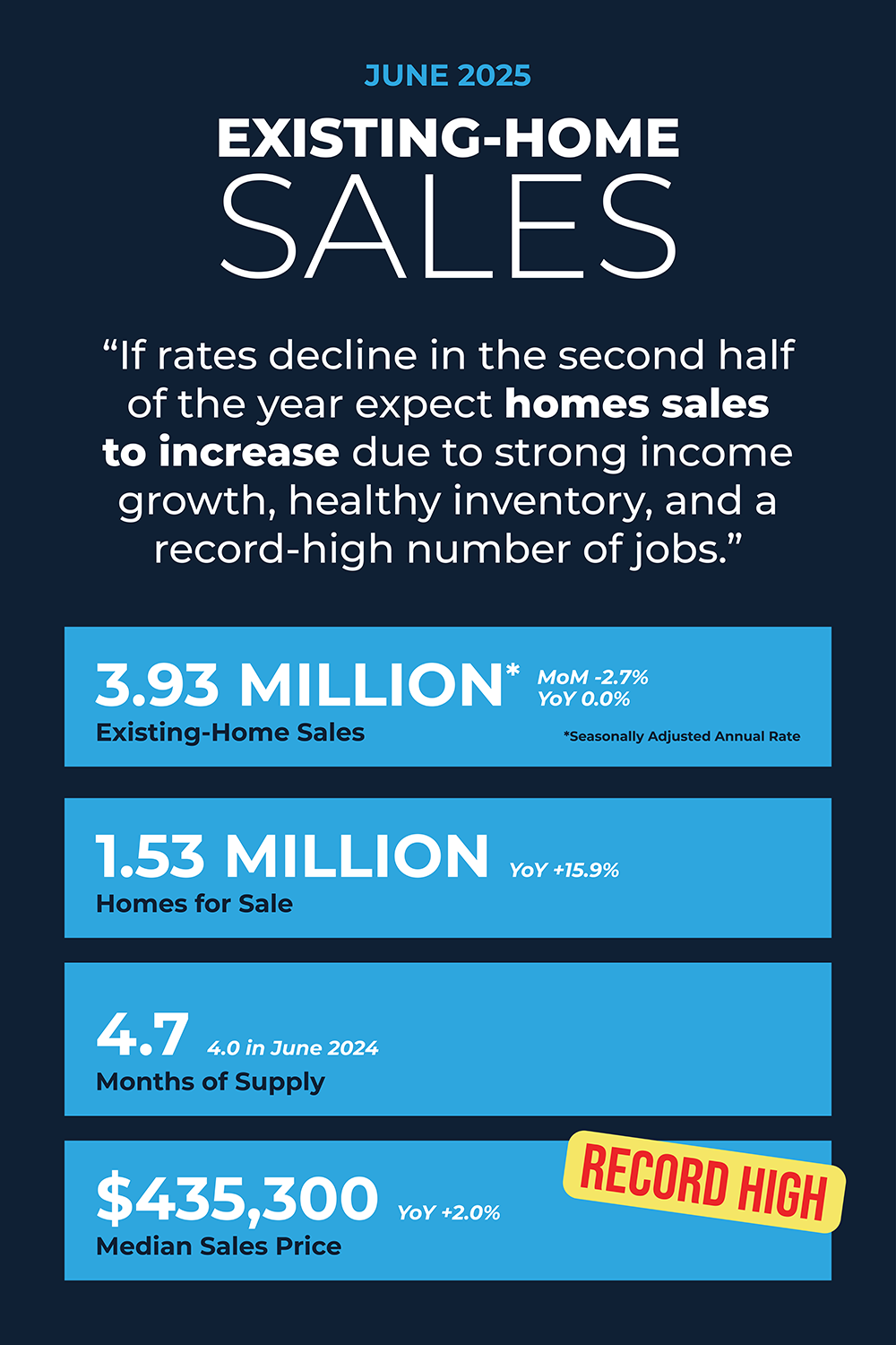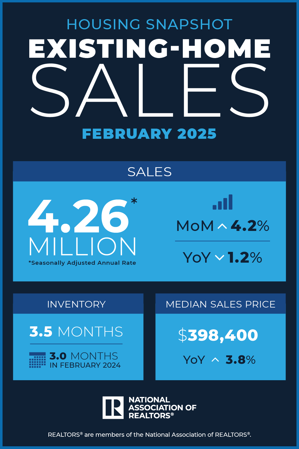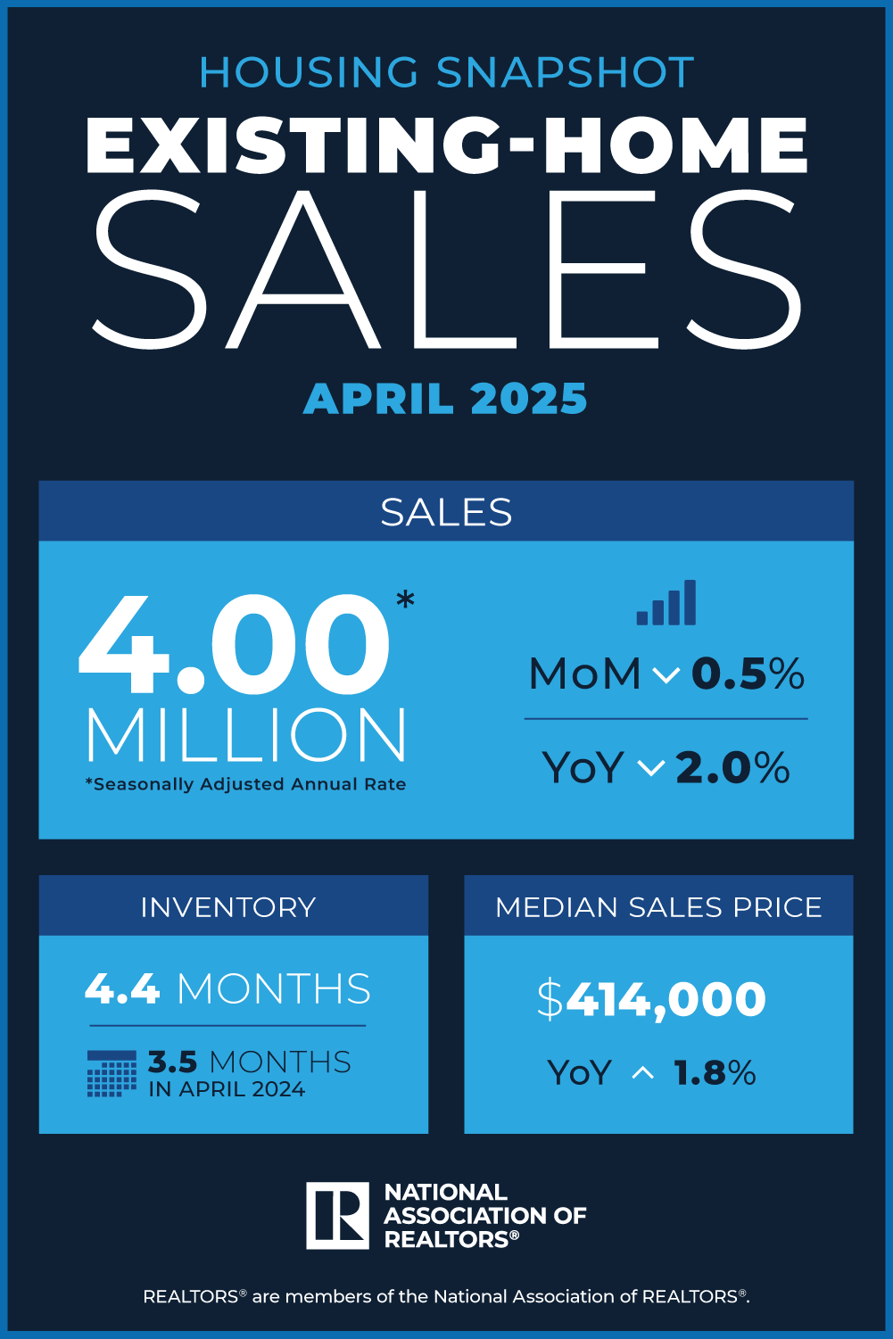 - 0.5% increase in existing-home sales month over month to a seasonally adjusted annual rate of 4.13 million.