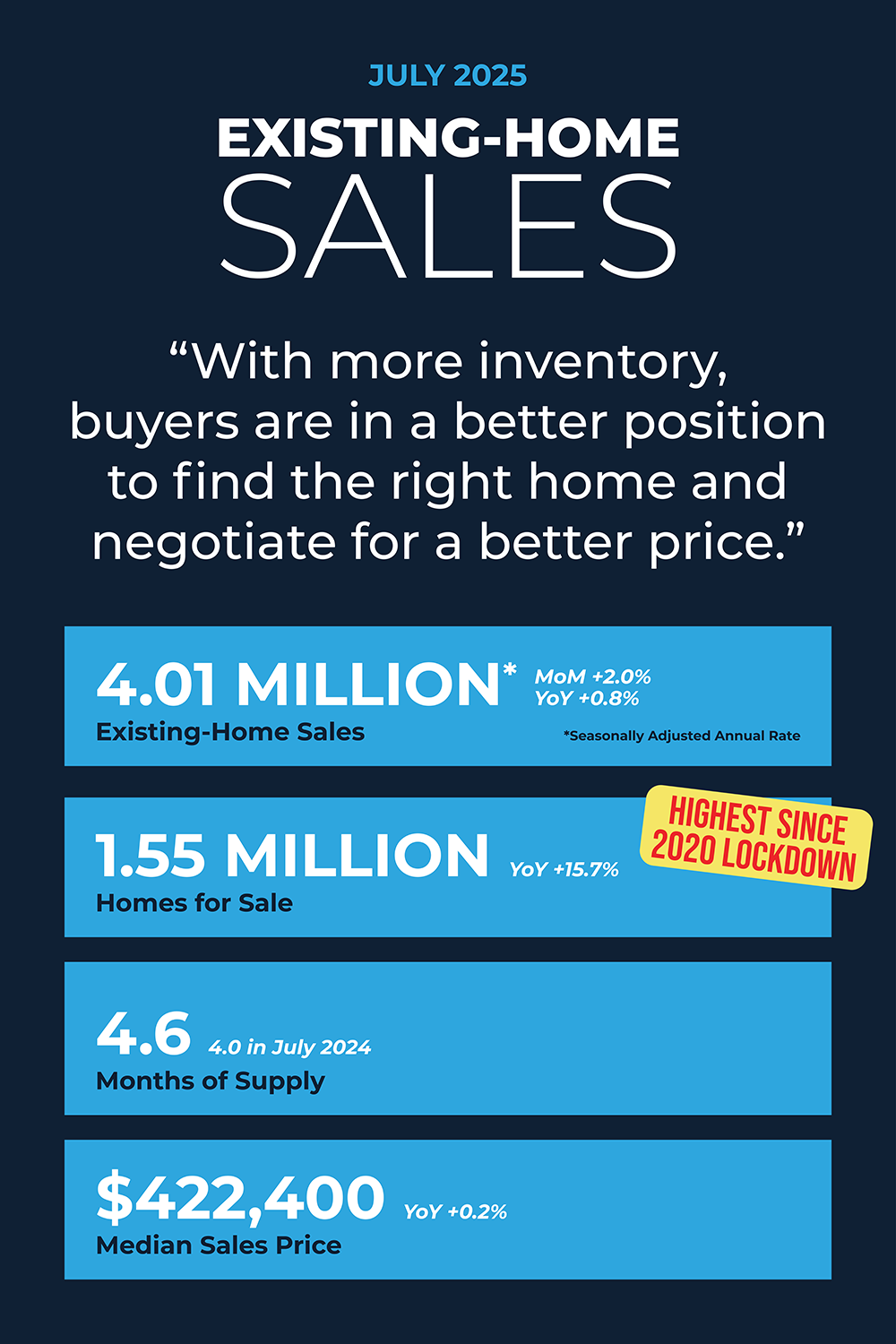 • 4.6-month supply of unsold inventory, down from 4.7 months in June and up from 4 months in July 2024.